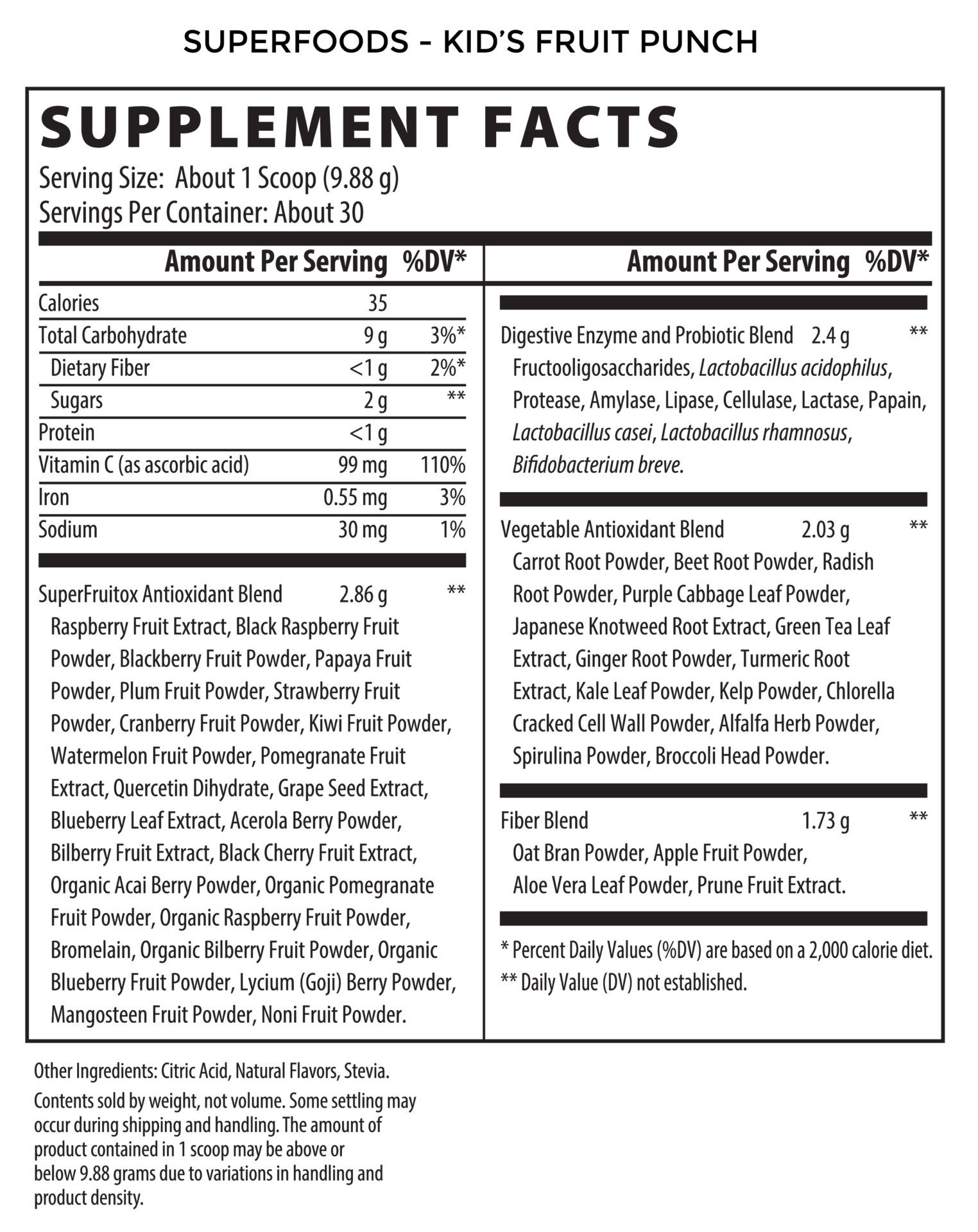 Healthy Kids Superfoods is an easy-to-mix great tasting formula with whole food concentrates to provide necessary nutrients, vitamins and enzymes as well as probiotics, antioxidants and phytonutrients for your little ones-- with the antioxidant power of 20+ servings of fruits and vegetables in each serving! This delicious fruit punch flavored juice alternative makes fruits and veggies easy and fun!